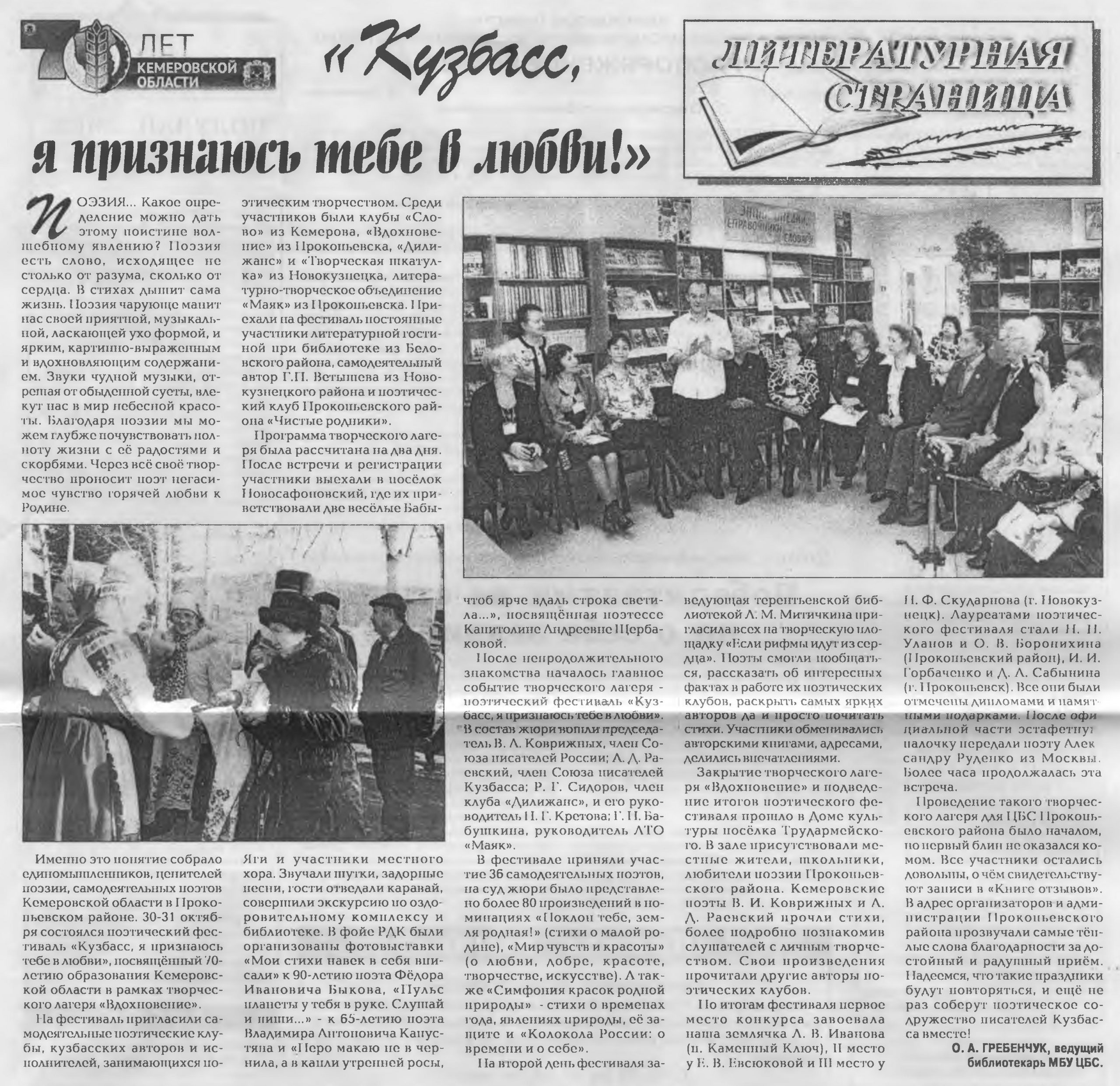 - Гребенчук, О. «Кузбасс, я признаюсь тебе в любви!» // Сельская новь. — 2012. — №86. — 13 ноября. — С.3. – Об открытом поэтическом фестивале «Кузбасс, я признаюсь тебе в любви», посвященном 70-летию образования Кемеровской области.