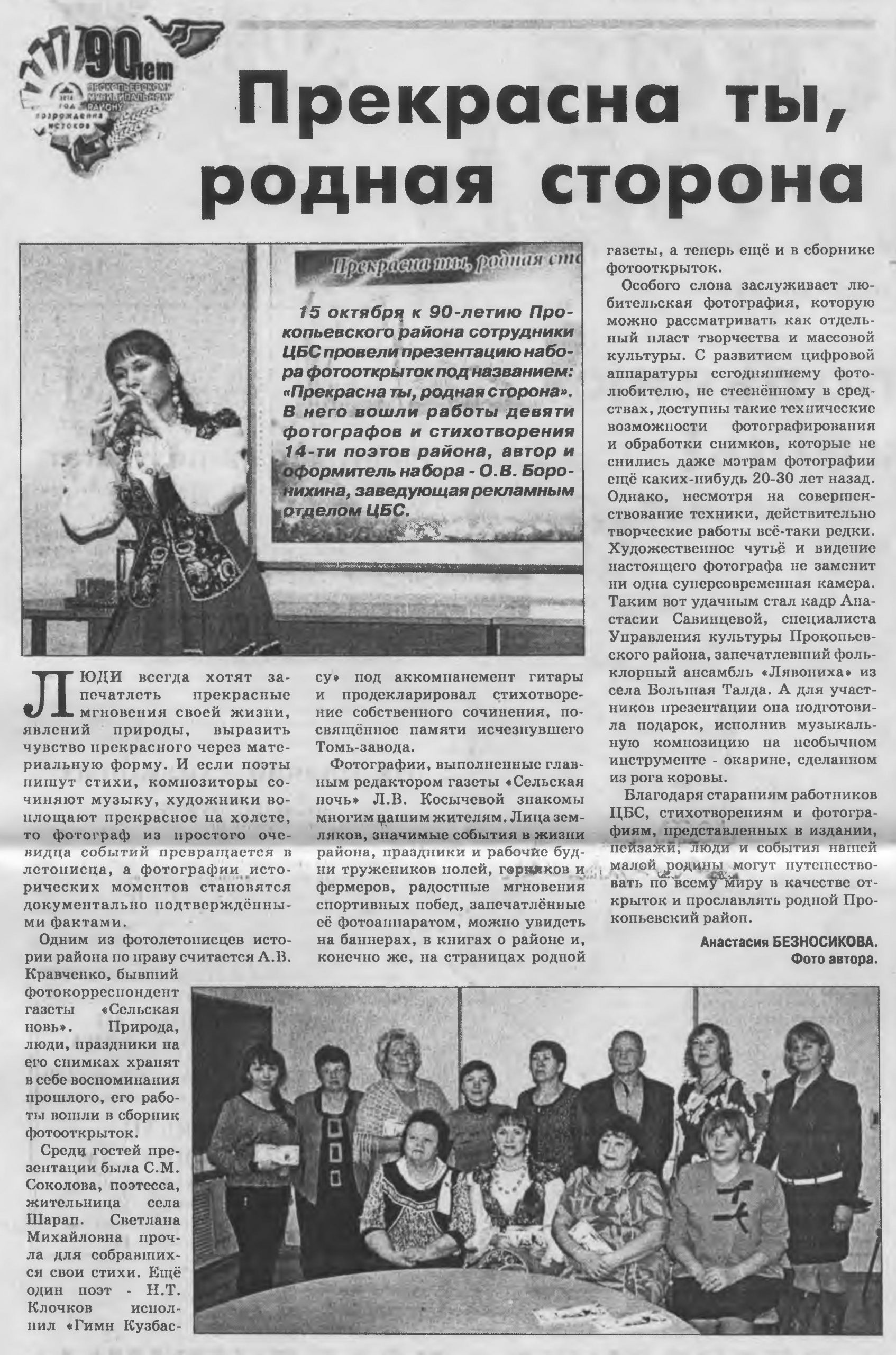 - Безносикова, А. Прекрасна ты, родная сторона. // Сельская новь. — 2014. — №81. — 21 октября. — С.2. — О презентации набора фото-открыток под названием: «Прекрасна ты, родная сторона», проведенной сотрудниками ЦБС к 90-летию Прокопьевского района. Автор и оформитель набора — О.В. Боронихина, заведующая рекламным отделом ЦБС.