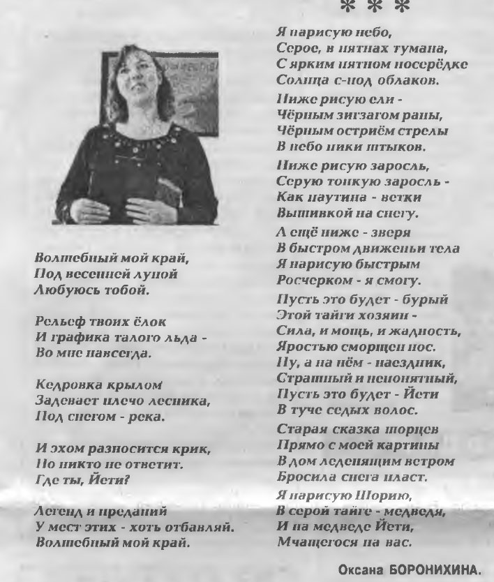 - Боронихина, О.В. Паучонок ; Волшебный кузбасский Йети ; и др. / О.В. Боронихина // Радуга детства : стихи для детей и о детях / редколлегия Гребенчук О., Боронихина О., Иванова Г. ; МБУ «ЦБС Прокопьевского муниципального округа». – Трудармейский, поселок, Кемеровская область, 2023. – С. 4-5.