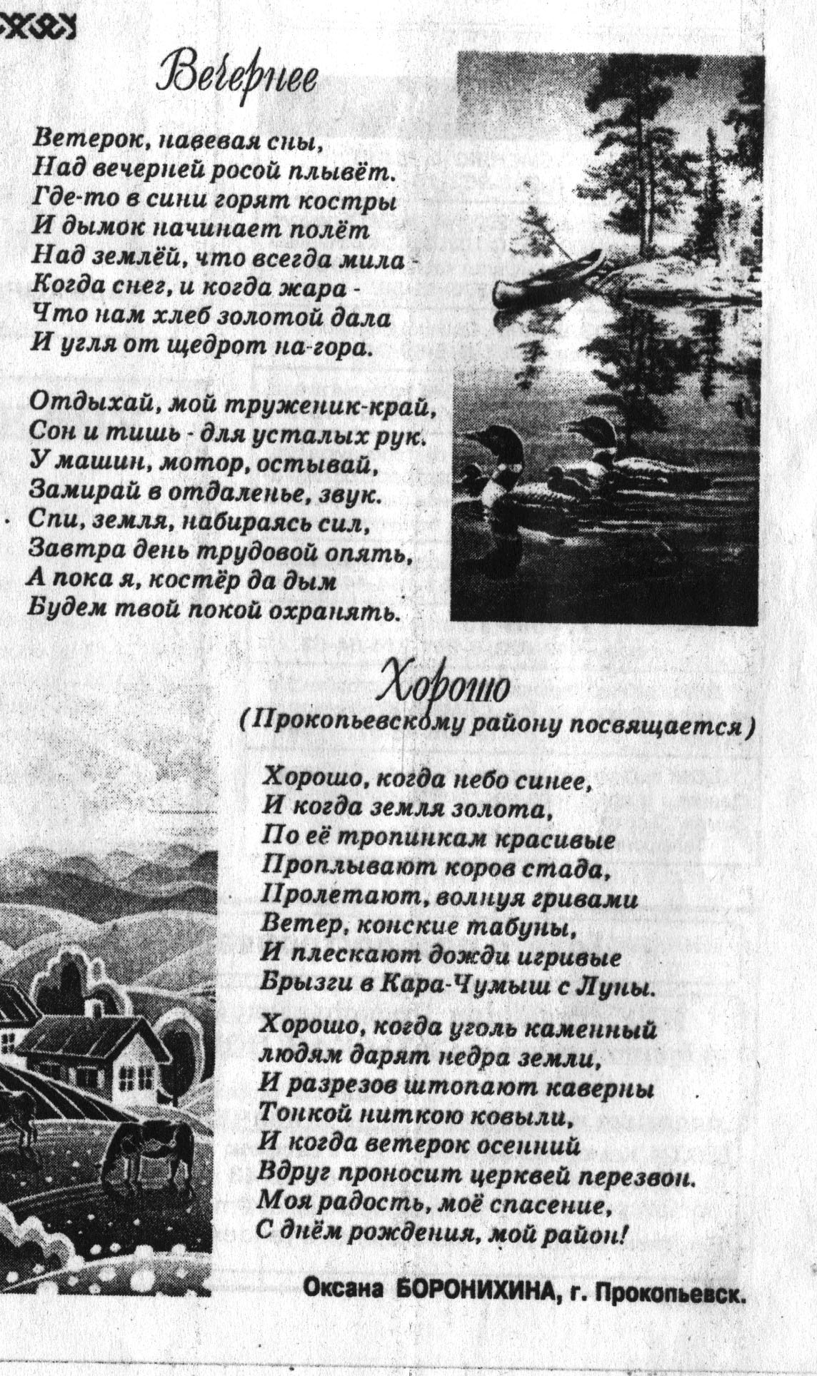 - Боронихина, О.В. Поэтам ; Прокопьевску ; Вечернее // Песнь о Кузбасской земле: материалы II поэтического фестиваля «В начале было Слово». – Прокопьевский район, 2008. — С. 27-28.