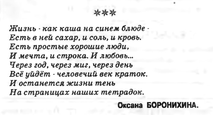- Боронихина, О. Жизнь — как каша на синем блюде -: стих-е // Сельская новь. — 2014. — №96. — 16 декабря. — С.3.