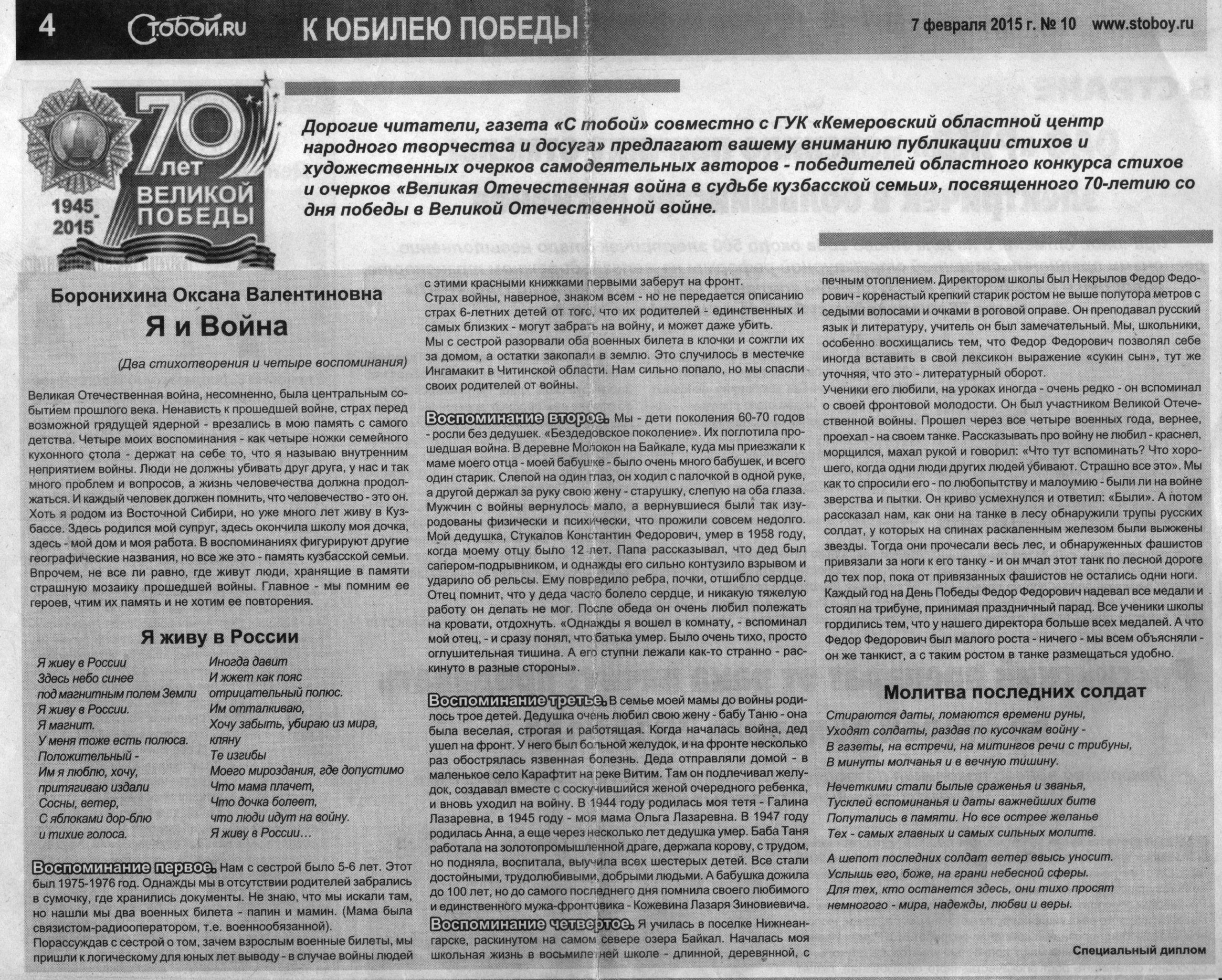 - Боронихина, О. Я и война: два стихотворения и четыре воспоминания // Стобой.ru. — 2015. — №10. – 7 февраля. — С.4. – Работа автора на областном конкурсе стихов и очерков «Великая Отечественная война в судьбе кузбасской семьи», награжденная специальным дипломом.