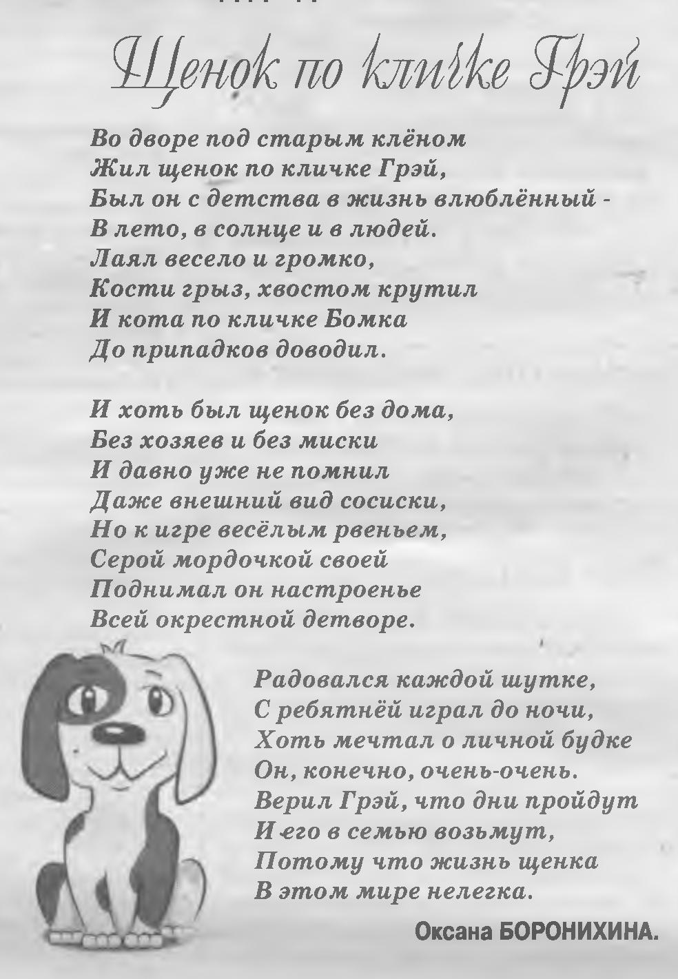 - Боронихина, О. Щенок по кличке Грэй: стихотворение // Сельская новь. — 2016. — №54. — 2 августа. — С.3.