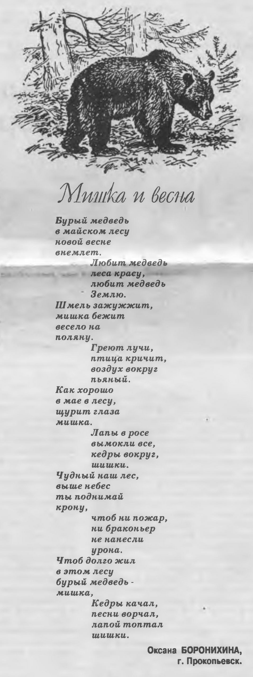 - Боронихина, О. Мишка и весна: стихотворение // Сельская новь. — 2017. — №73. — 26 сентября. — С.11.