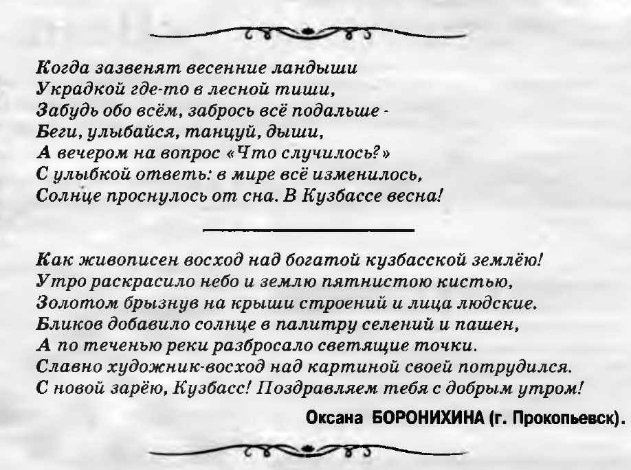 - Боронихина, О.В. Прокопьевск // Родник талантов земли родной: литературный альманах. – Прокопьевский район, 2009. — С. 9.
