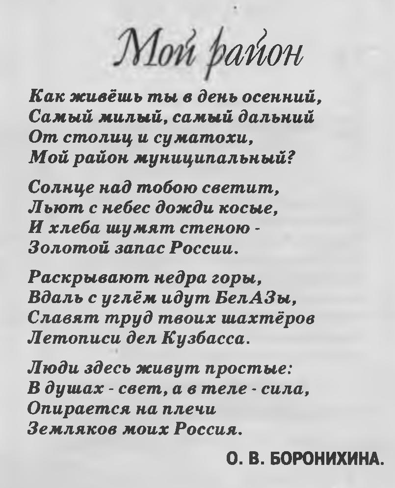 - Боронихина, О. Мой район: стихотворение // Сельская новь. — 2019. — №67. — 29 августа. — С.11.