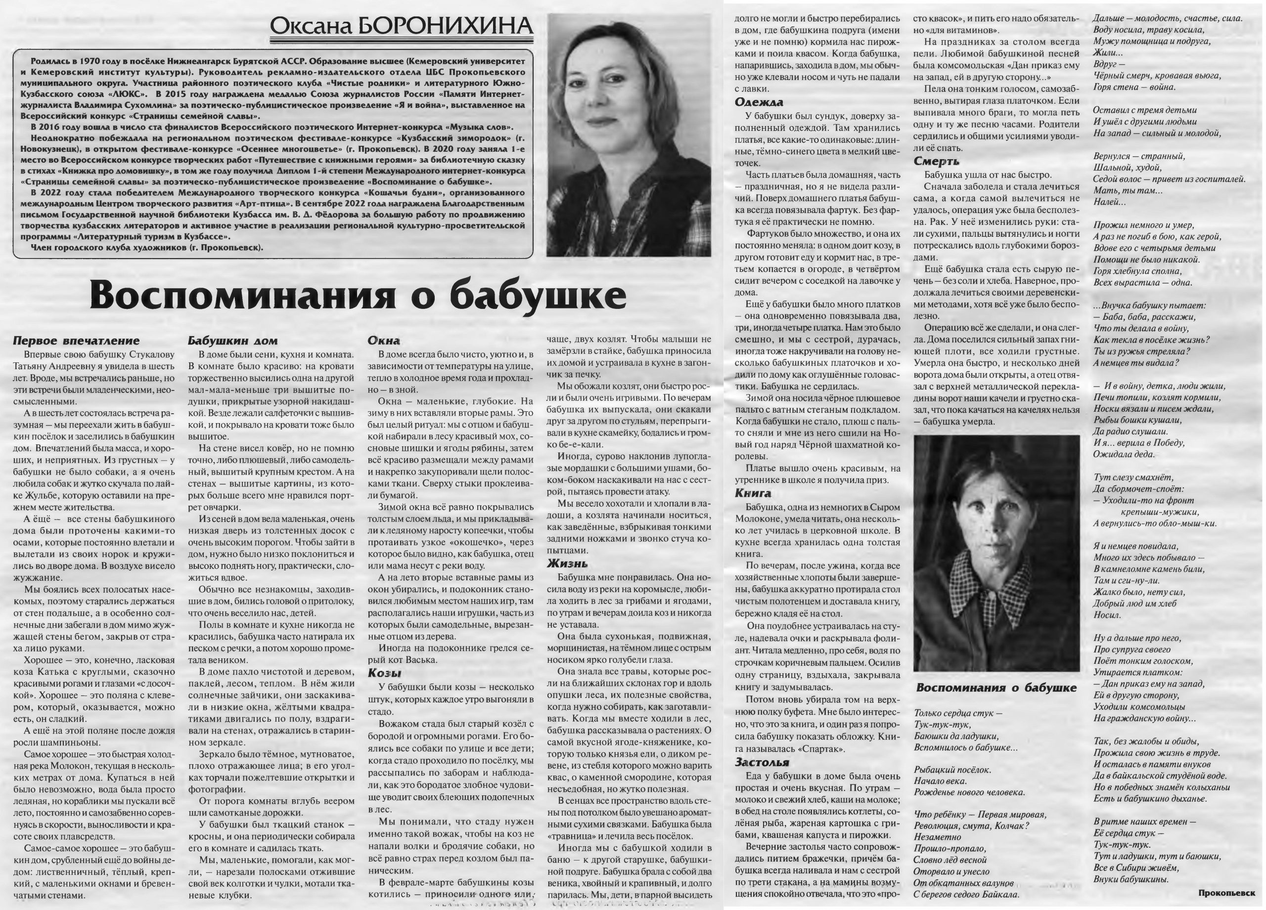 - Боронихина, О.В. Воспоминания о бабушке ; От учителя до героя [публицистика] / О. В. Боронихина // О войне написано не всё…: литературно-поэтический сборник о Великой Отечественной войне 1941-1945 гг. — МБУ «Централизованная библиотечная система Прокопьевского муниципального округа», 2020. — С. 49-51, 78-82.