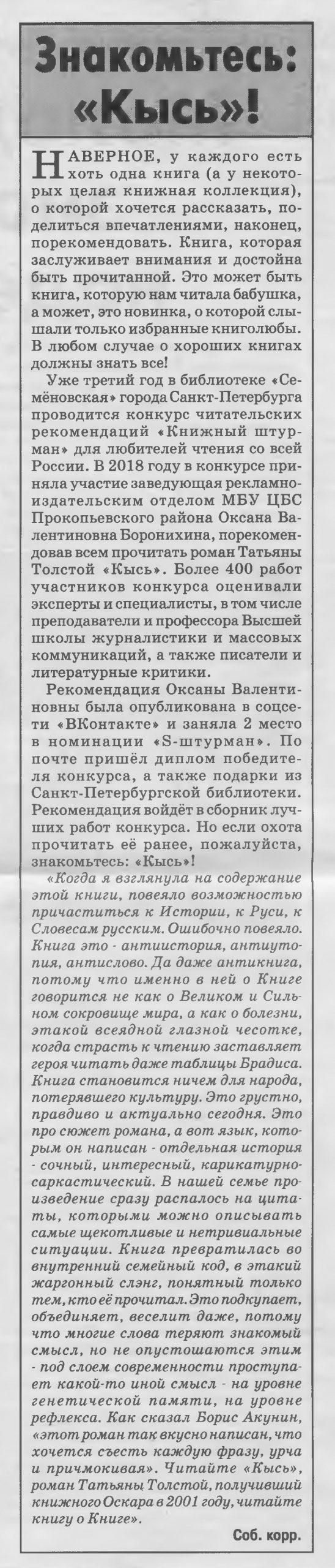 - Соб. корр. Знакомьтесь: «Кысь»! // Сельская новь. — 2018. — №47. — 26 июня. — С.4. — Зав. рекламно-издательским отделом МБУ ЦБС О.В. Боронихина, приняла участие и стала победителем конкурса читательских рекомендаций «Книжный штурман» в библиотеке «Семеновская» г. Санкт-Петербурга.