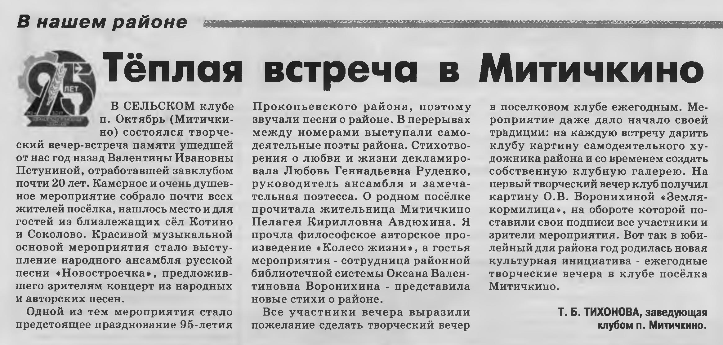 - Тихонова, Т. Теплая встреча в Митичкино // Сельская новь. — 2019. — №67. — 29 августа. — С.11. — О творческом вечере-встрече в п. Митичкино.