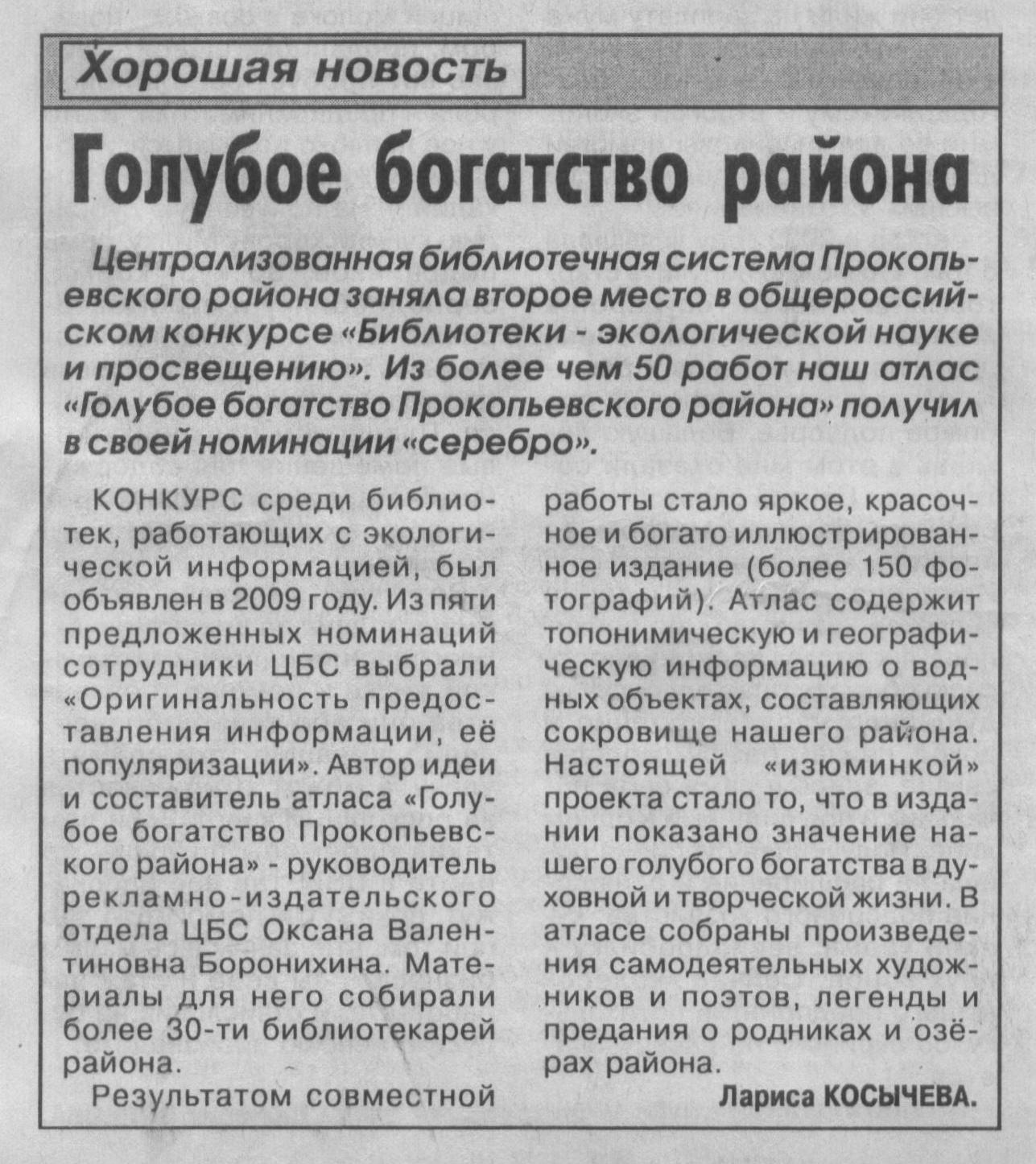 - Косычева, Л. Голубое богатство района // Сельская новь. — 2010. — №67. — 16 сент. — С.1. – Электронный атлас занял второе место в общероссийском конкурсе «Библиотеки — экологической науки и просвещению».