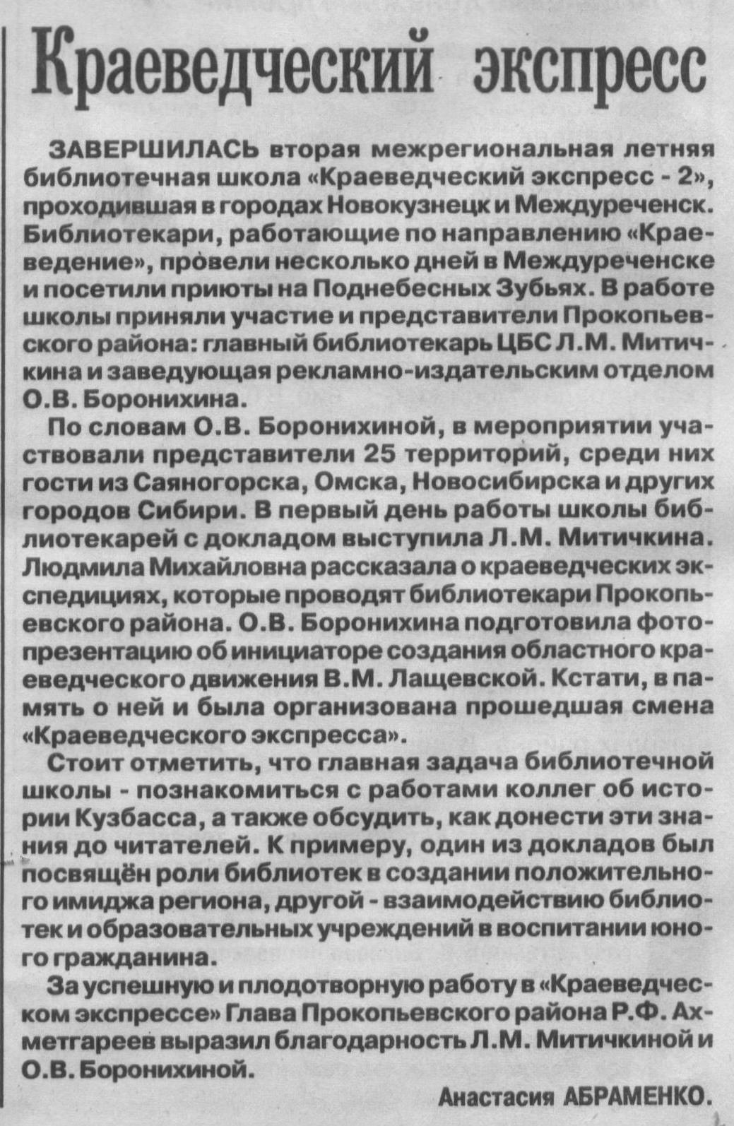 - Абраменко, А. Краеведческий экспресс // Сельская новь. — 2010. — №71. — 30 сент. — С.2. — О работе второй межрегиональной летней библиотечной школе «Краев. экспресс — 2», проходивший в городах Новокузнецк и Междуреченск.