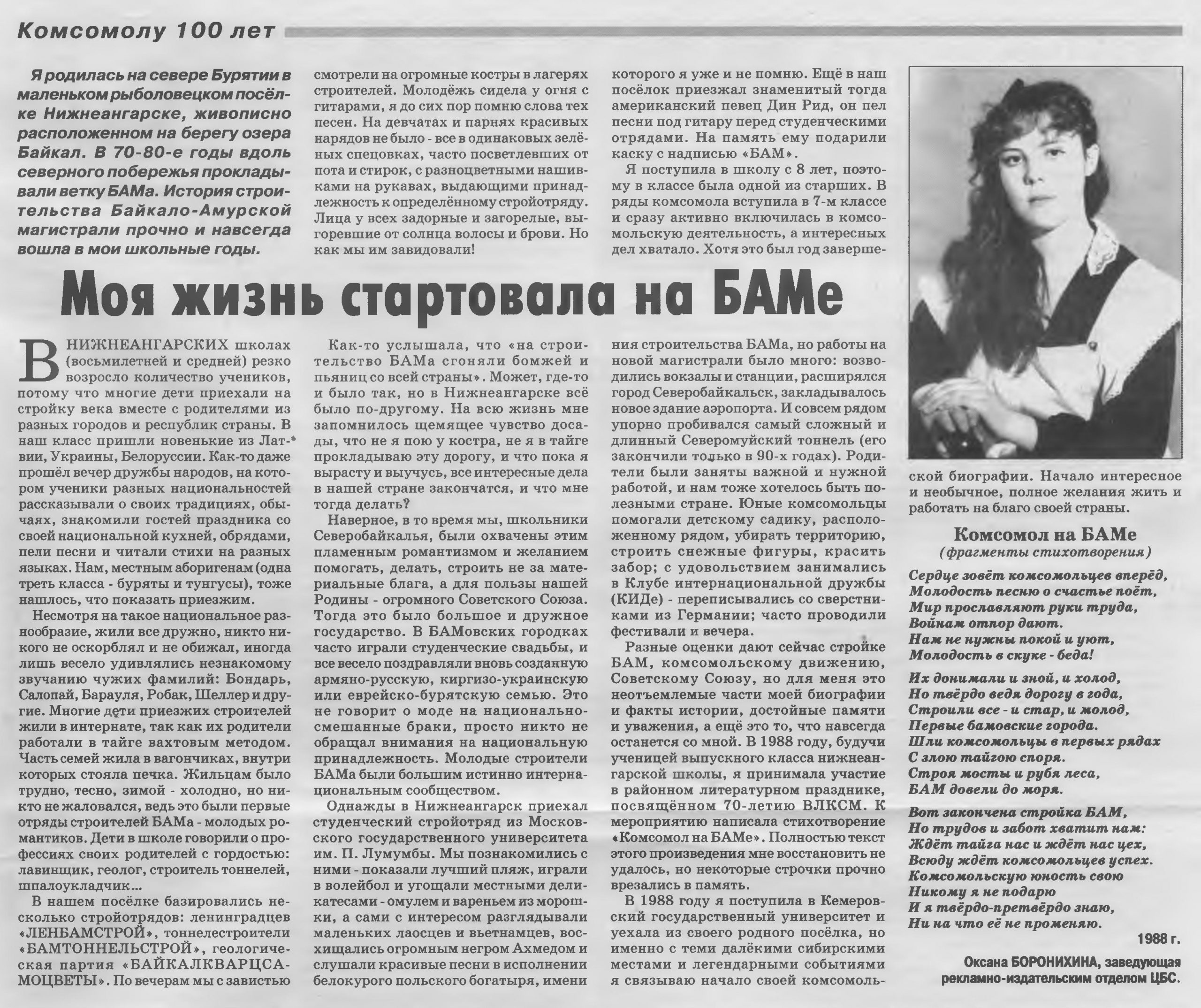 - Боронихина, О. Моя жизнь стартовала на БАМе ; Комсомол на БАМе // Сельская новь. — 2018. — №87. — 15 ноября. — С.11. – Воспоминания и стихотворение о времени учебы в школе – времени строительства Байкало-Амурской магистрали.