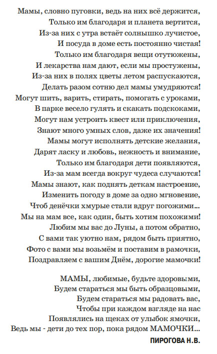 - Пирогова, Н. «Мамы, словно пуговки…» : стихотворение // Сельская новь. — 2025. — №89. — 27 ноября. — С. 9.