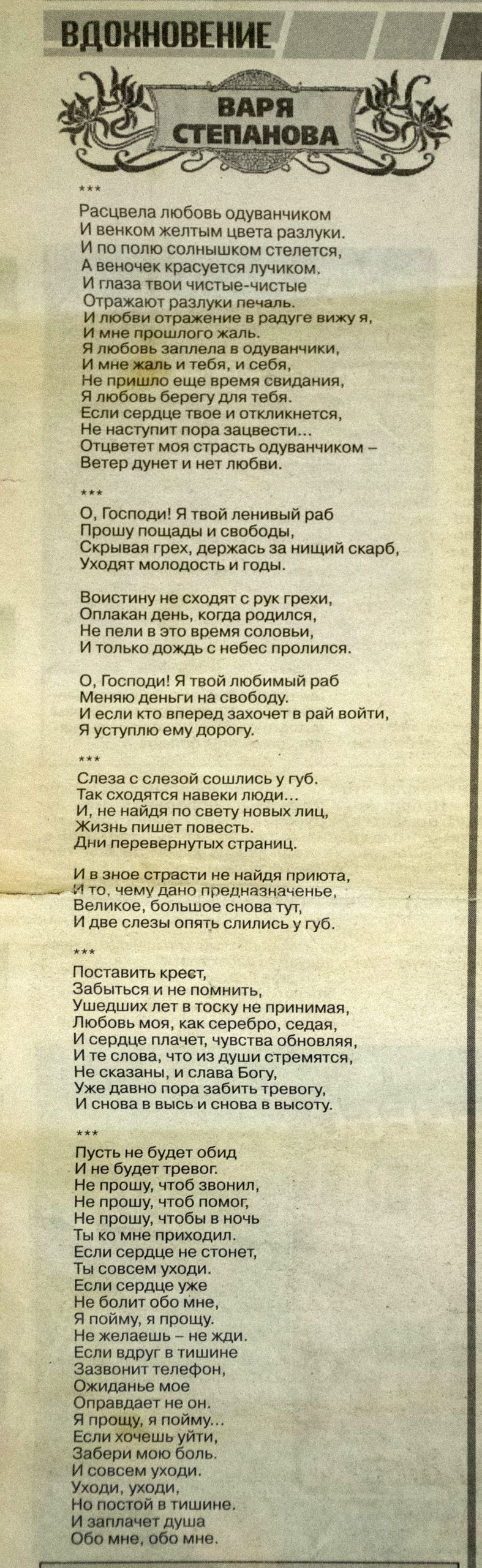 Степанова, В. «Расцвела любовь одуванчиком…» ; «О, Господи! Я твой ленивый раб…» ; «Слеза с слезой сошлись у губ…» ; «Поставить крест, забыться…» ; «Пусть не будет обид…» : стихи // Мега Экспресс. — 2007. — №…. — 2-9 ноября. — С.7. – рубр. «Вдохновение».
