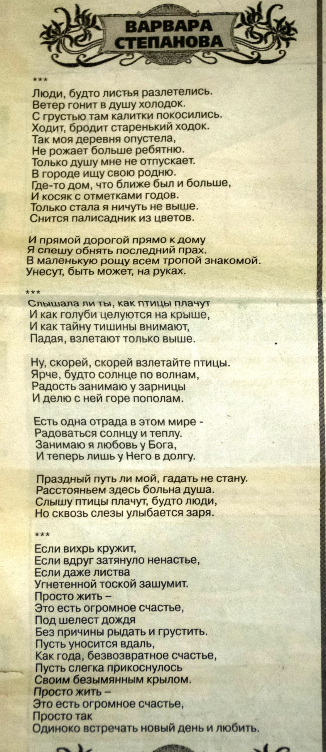 Степанова, В. «Люди, будто листья разлетелись…» ; «Слышала ли ты, как птицы плачут…» ; «Если вихрь кружит…» : стихи // Мега Экспресс. — 2007. — №…. — 7-17 декабря. — С.7. – рубр. «Вдохновение».