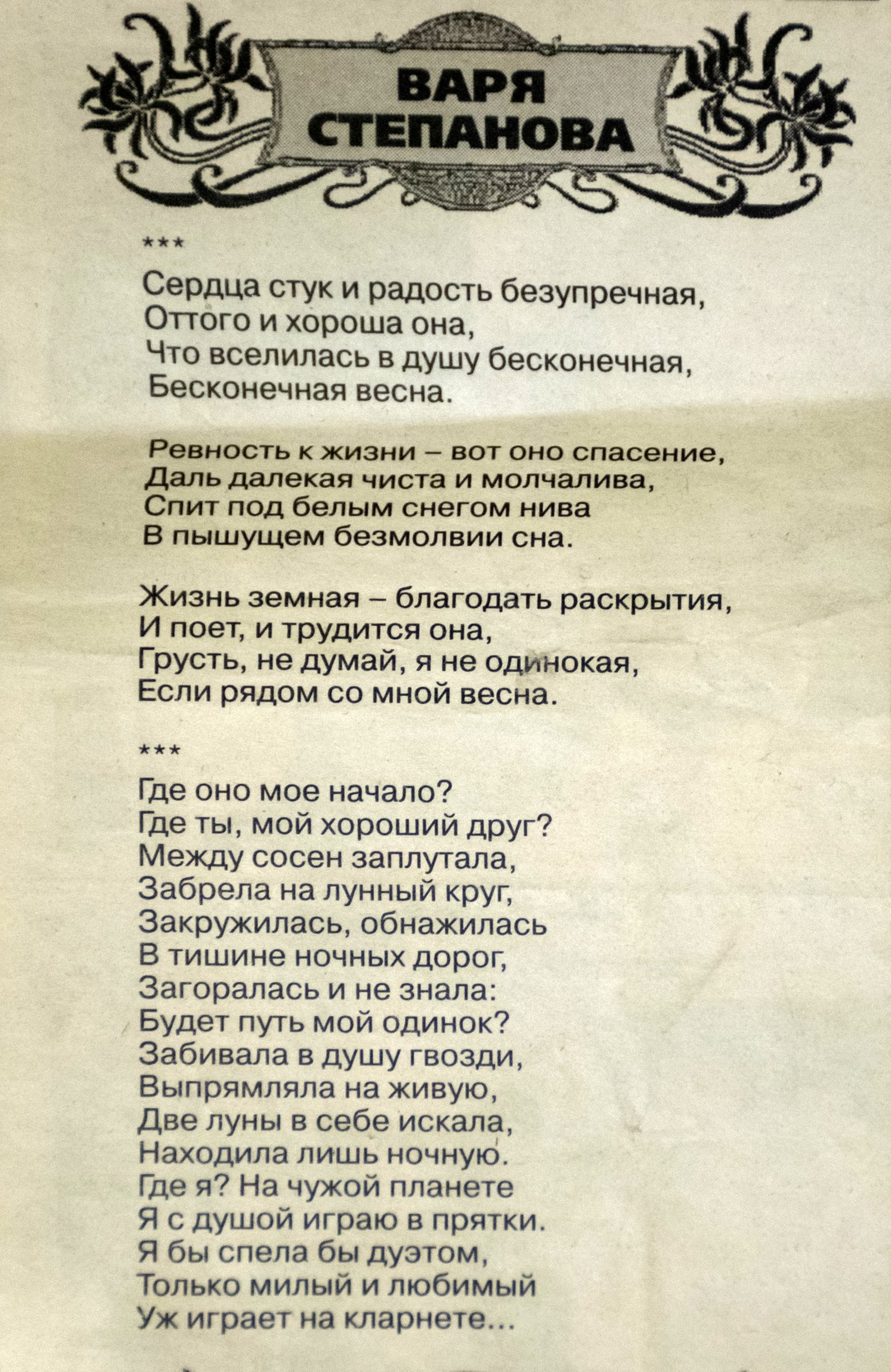Степанова, В. «Где оно. моё начало…» ; «Сердца стук и радость безупречная…» : стихи // Мега Экспресс. — 2008. — №…. — 18-25 января. — С.7. – рубр. «Вдохновение».